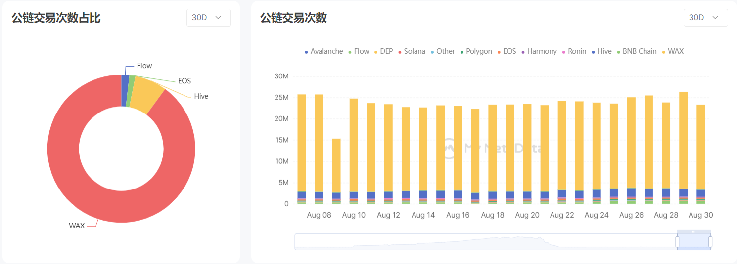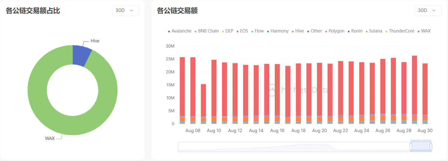 与 6 月和 7 月不同，8 月的交易额和交易次数的主要贡献者都来自于 WAX 链。WAX 链的 3 个头部链游 Alien Worlds、Splinterlands 和 Farmers World 一直都保持着非常高的活跃度，再加上后起的 Upland，也为 WAX 的活跃贡献了不小的力量。