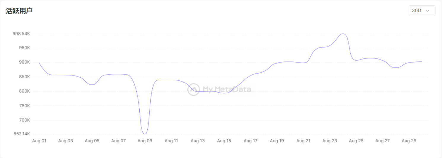 My MetaData 数据显示，最新 GameFi 游戏数量为 1686 个，相比 7 月增长 9%。月末活跃用户数为 902110，相较 7 月末增加了约 6%；而 8 月的活跃用户峰值数为 998537，相较于 7 月的活跃峰值下降了约 5% 。