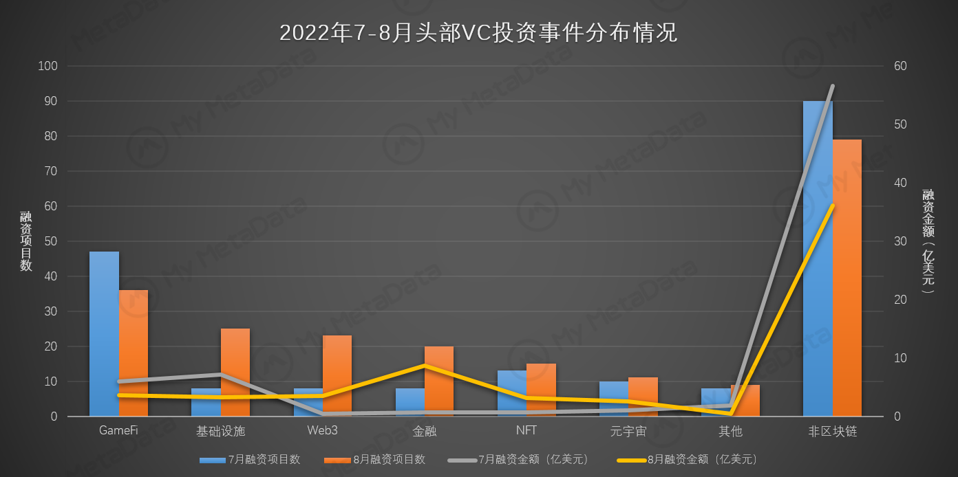 8 月头部 VC 进行了 219 次投资，总涉及金额 219 亿美元。VC 在 GameFi 和非区块链领域的投资规模有所收缩，而在区块链其他领域的投资比重有所增加。
