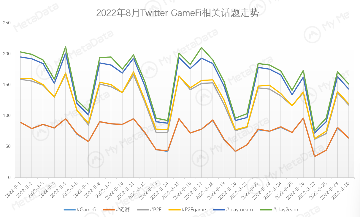 与 7 月相比，GameFi 相关话题讨论的热度整体数据不变，但是峰值有所下降。其中，#playtoearn 和 #play2earn 的讨论数据最高。