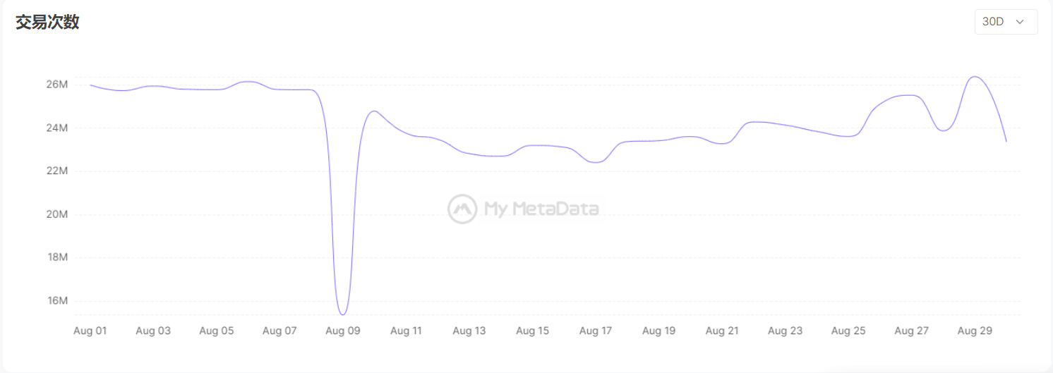 根据上图的趋势走向来看，8 月链游用户活跃度趋于平稳，仅在 8 月 9 日当天出现急剧下降的情况，这是因为 Polygon 链游 Dragoma 在当日突然撤走流动性，其 Token DMA 暴跌超过了 99%。这一数据在交易次数的曲线图上也有同样的反应。