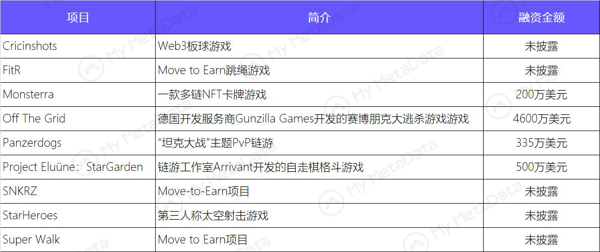 其中，GameFi 赛道发生融资事件 36 起，涉及金额 3.6 亿美元；基础设施赛道发生融资事件 25 起，涉及金额 3.3 亿美元；Web3 赛道发生融资事件 23 起，涉及金额 3.4 亿美元；金融赛道发生融资事件 20 起，涉及金额 8.6 亿美元；NFT 赛道发生融资事件 15 起，涉及金额 3.1 亿美元；元宇宙赛道发生融资事件 11 起，涉及金额 2.5 亿美元；区块链其他赛道 发生融资事件 9 起，涉及金额 0.5 亿美元。